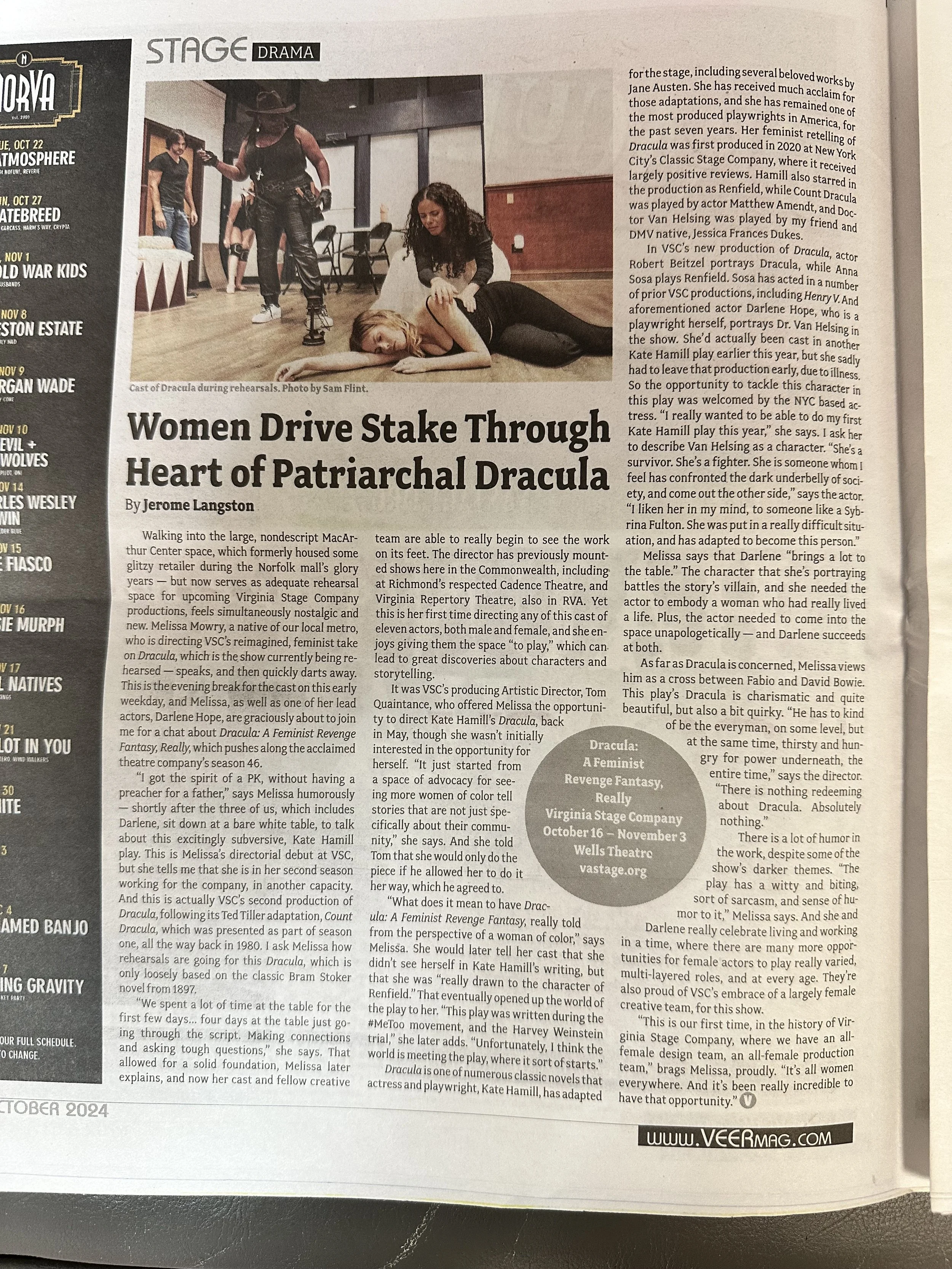 Walking into the large, nondescript MacArthur Center space, which formerly housed some glitzy retailer during the Norfolk mall's glory years β but now serves as adequate rehearsal space for upcoming Virginia Stage Company productions, feels simultaneously nostalgic and new. Melissa Mowry, a native of our local metro, who is directing VSC's reimagined, feminist take on Dracula, which is the show currently being rehearsed - speaks, and then quickly darts away. This is the evening break for the cast on this early weekday, and Melissa, as well as one of her lead actors, Darlene Hope, are graciously about to join me for a chat about Dracula: A Feminist Revenge Fantasy, Really, which pushes along the acclaimed theatre company's season 46.