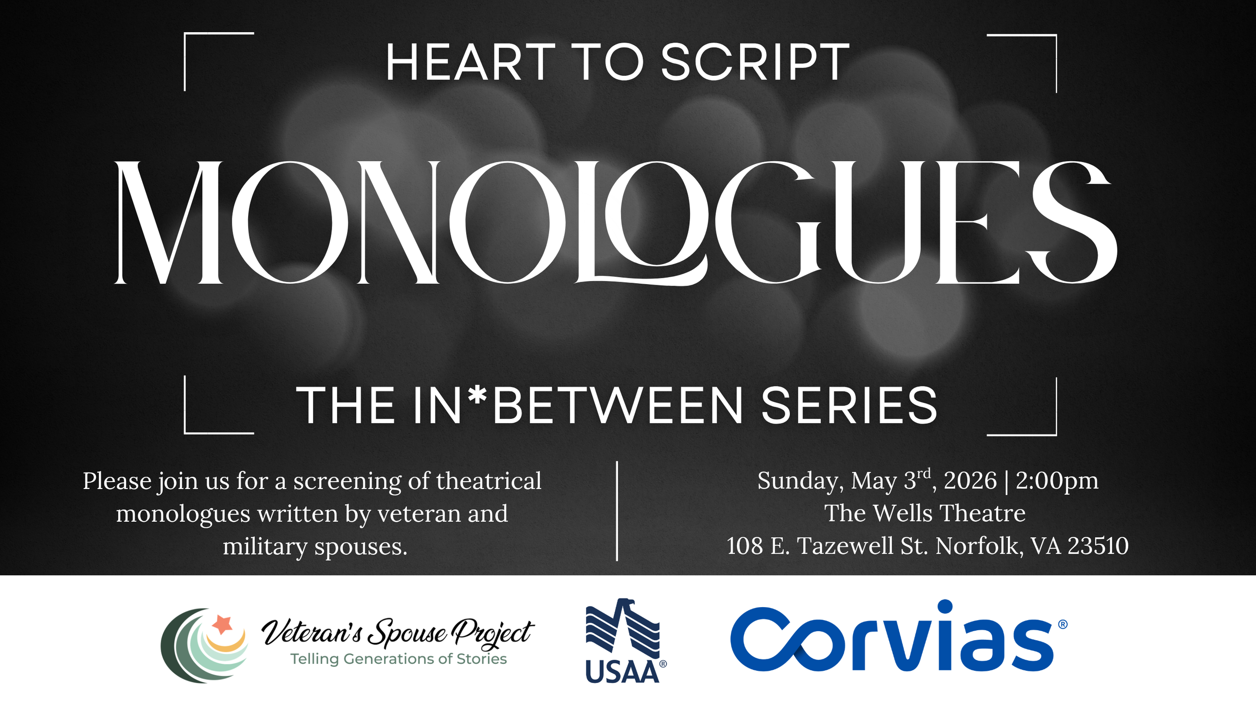 On May 3, in partnership with Virginia Stage Company, VSP will host a free community screening of Heart to Script Monologues: The inBetween Series. This event features monologues written by military and veteran spouses and performed by professional actors. All pieces were developed over two years in VSPβs Heart to Script monologue writing program. Following the screening, VSP will facilitate a community talkback designed to deepen understanding between military and civilian audiences in Hampton Roads.