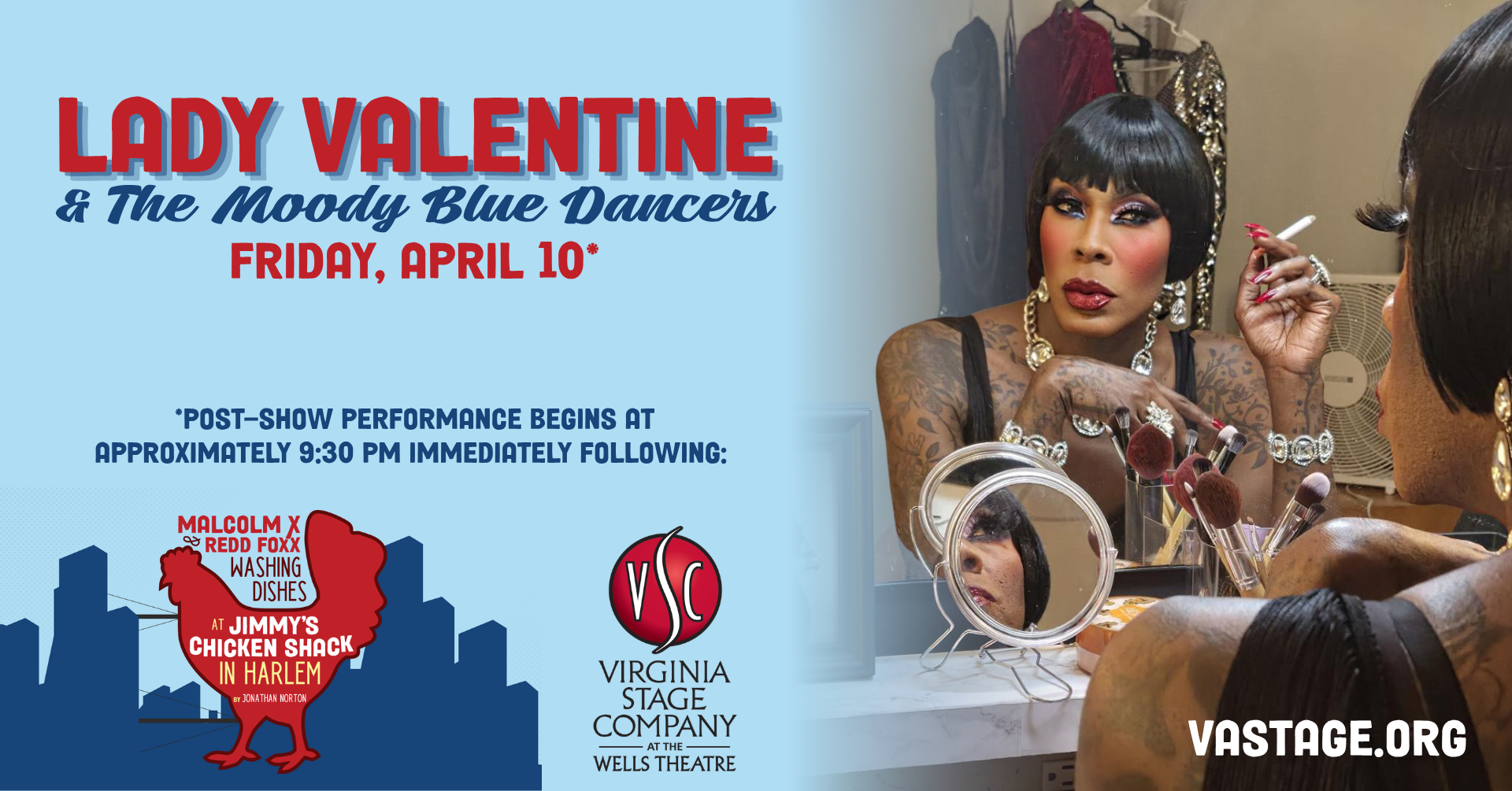 Following the performance of Malcolm X & Redd Foxx Washing Dishes at Jimmy’s Chicken Shack in Harlem, audiences are invited to stay for a special post-show event: Lady Valentine and the Moody Blue Dancers, starring the dynamic Vivian Valentine.